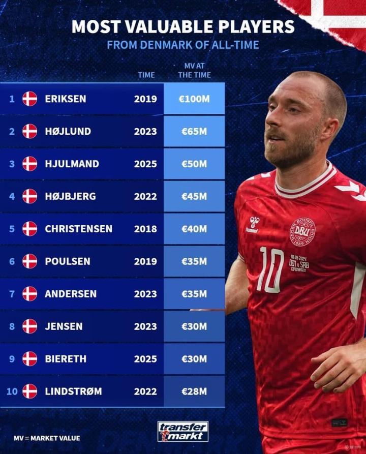 德转列丹麦球员历史身价榜:埃里克森1亿第1,霍伊伦6500万第2